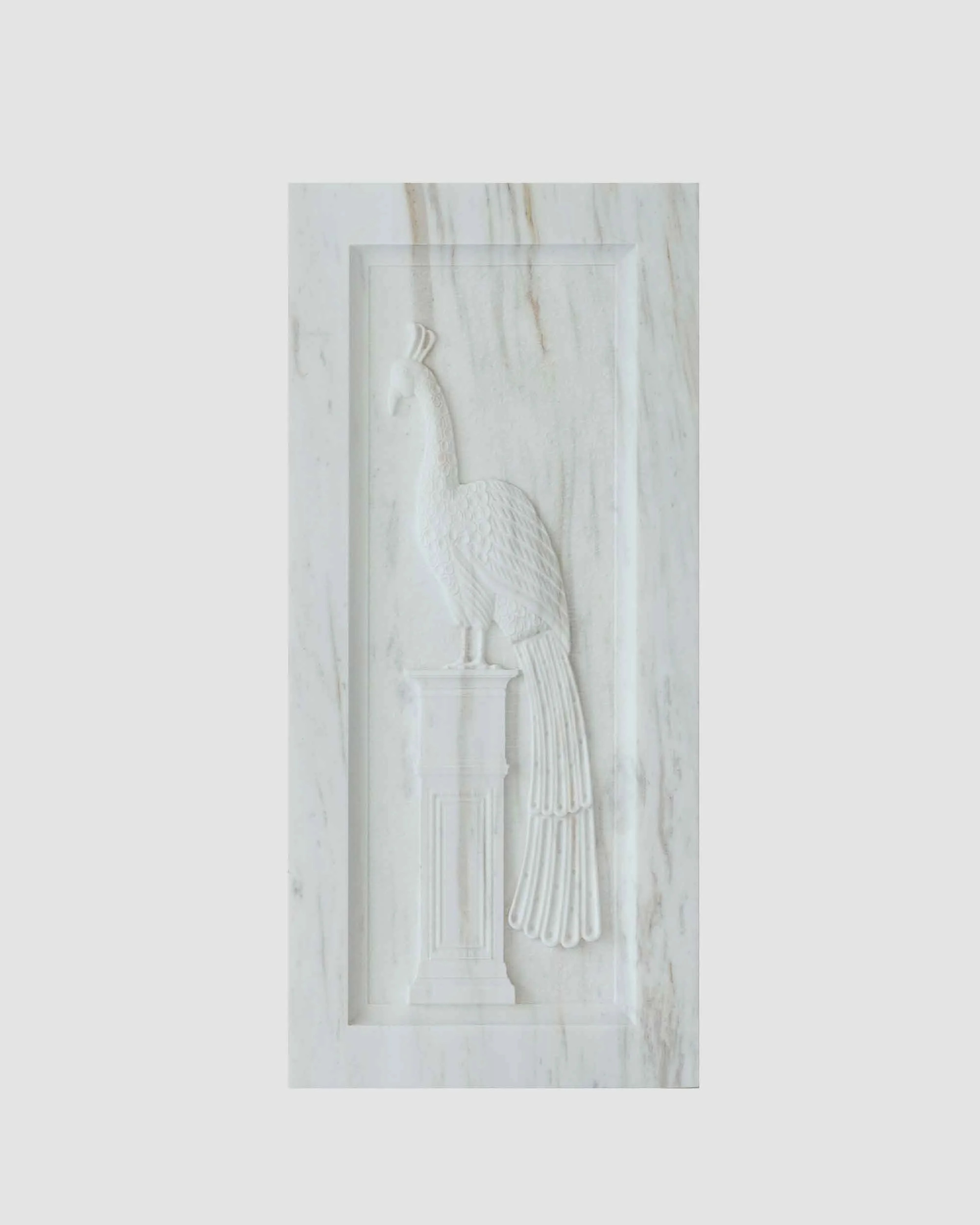 Σκαλιστό ορθογώνιο ανάγλυφο από λευκό μάρμαρο με παράσταση παγωνιού