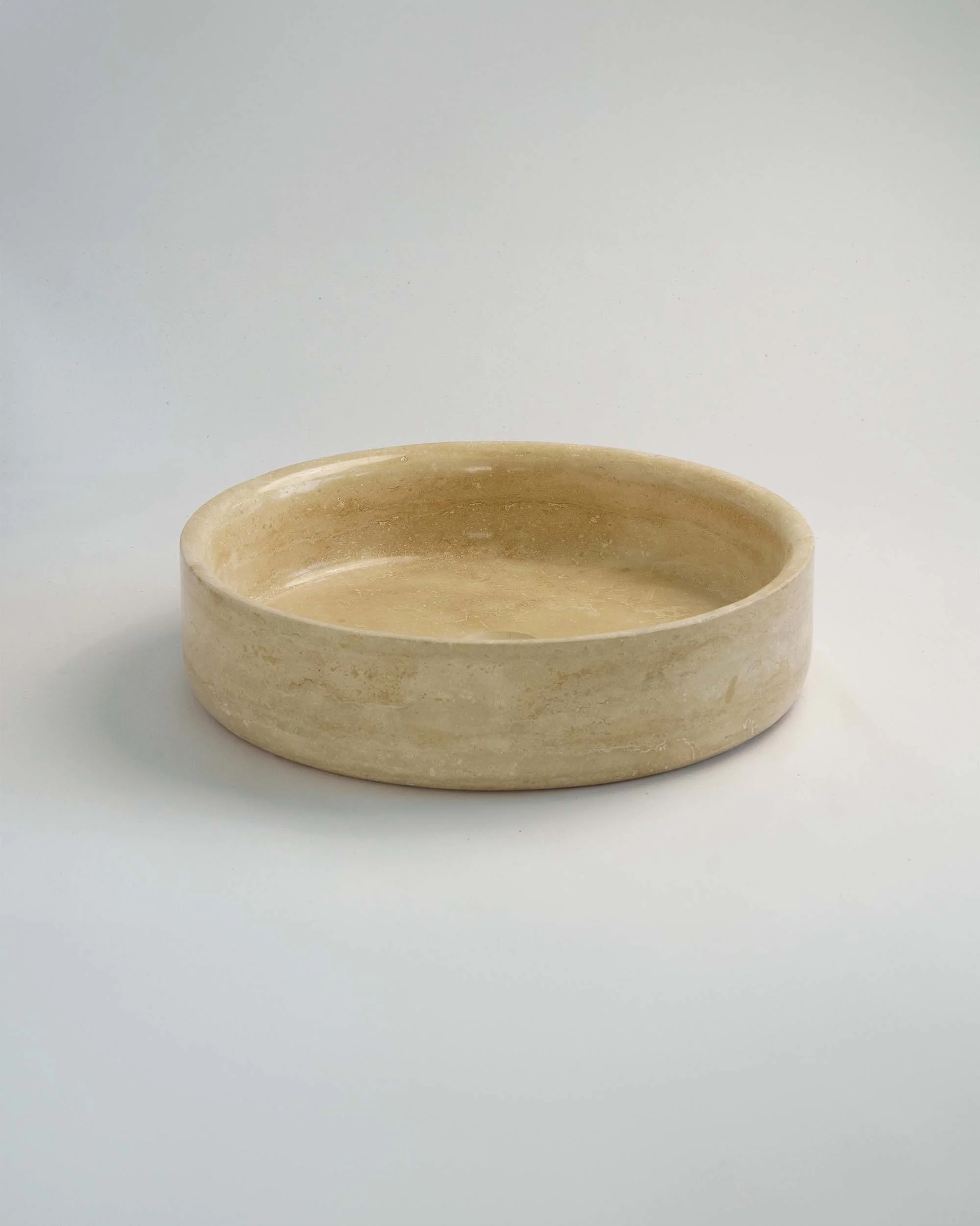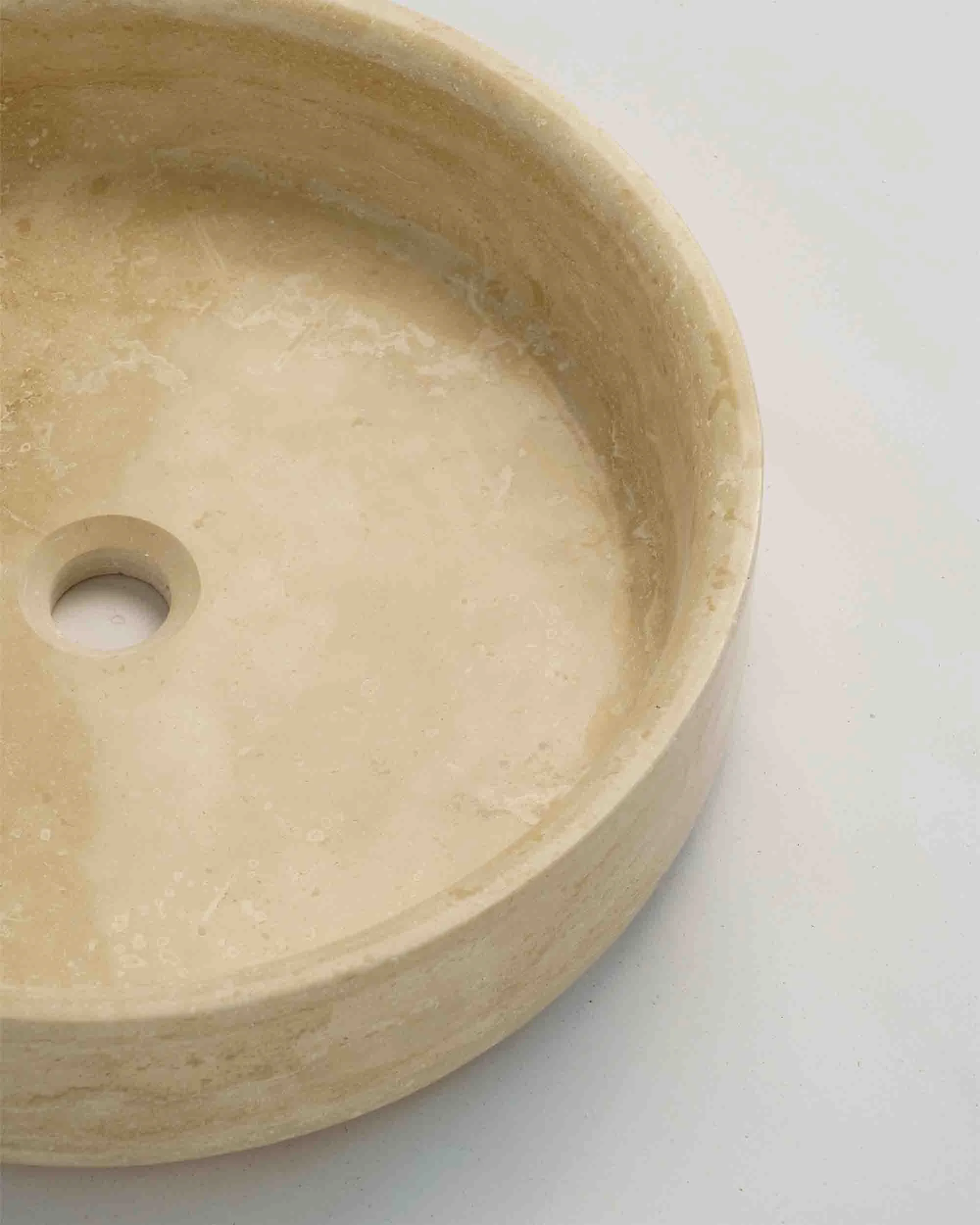 Κρεμ στρόγγυλος νιπτήρας από πορόλιθο με επίπεδο πάτο.