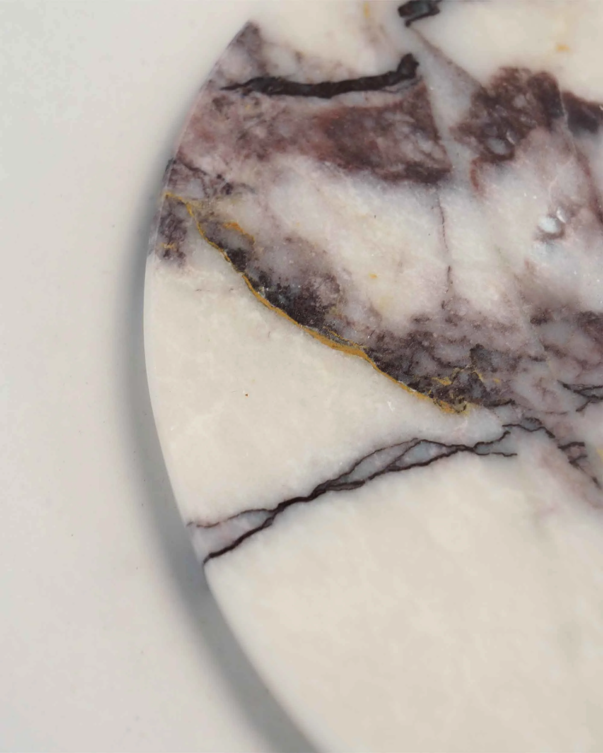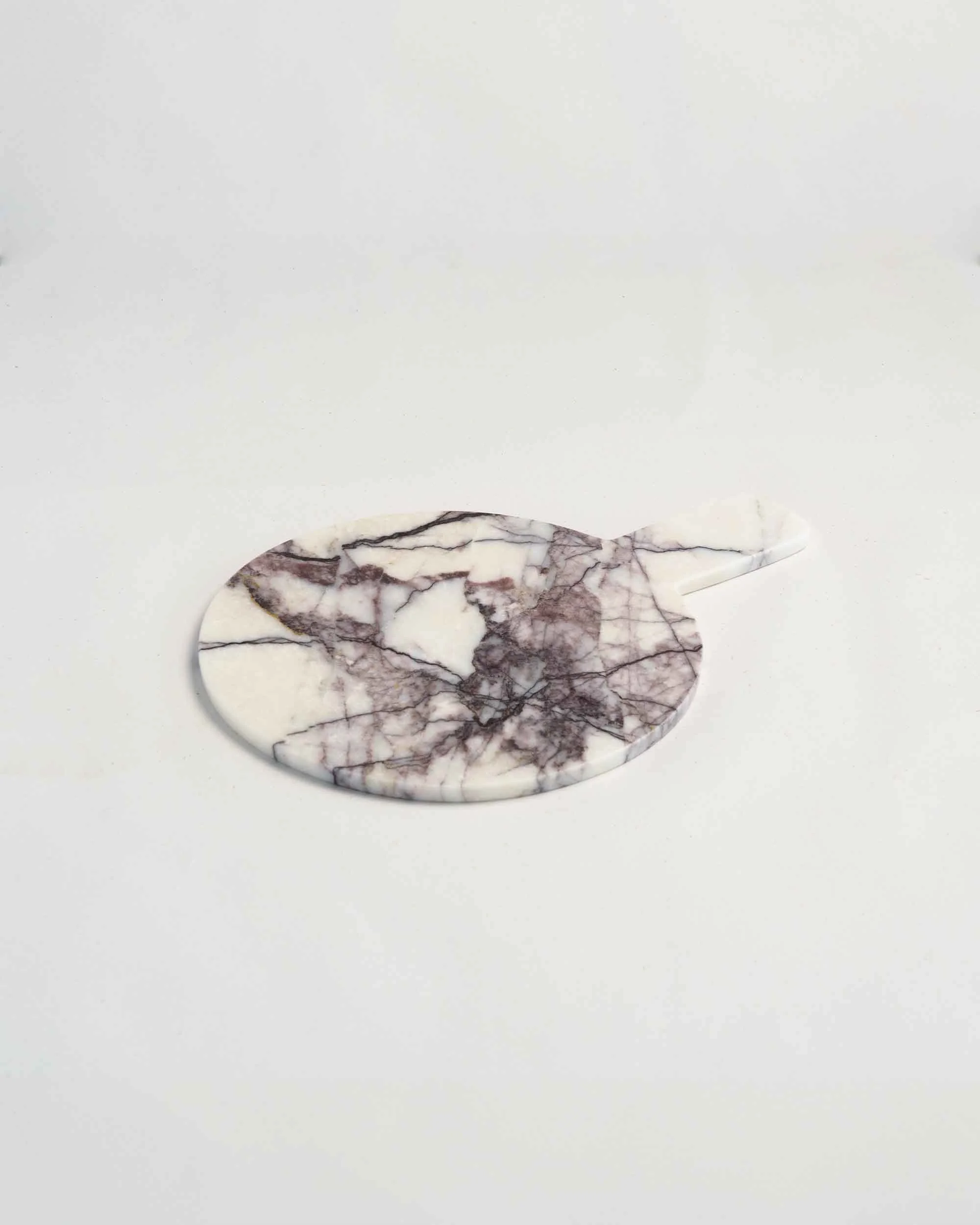 Μαρμάρινη ασπρόμαυρη βάση κοπής στρόγγυλη με χερούλι, πάχους 1 εκατοστού.